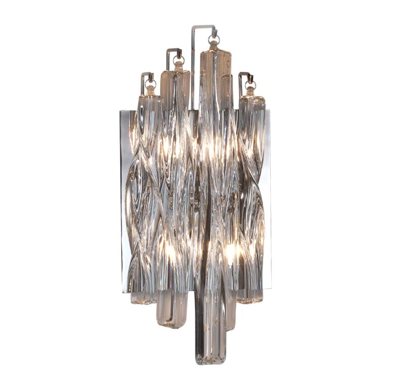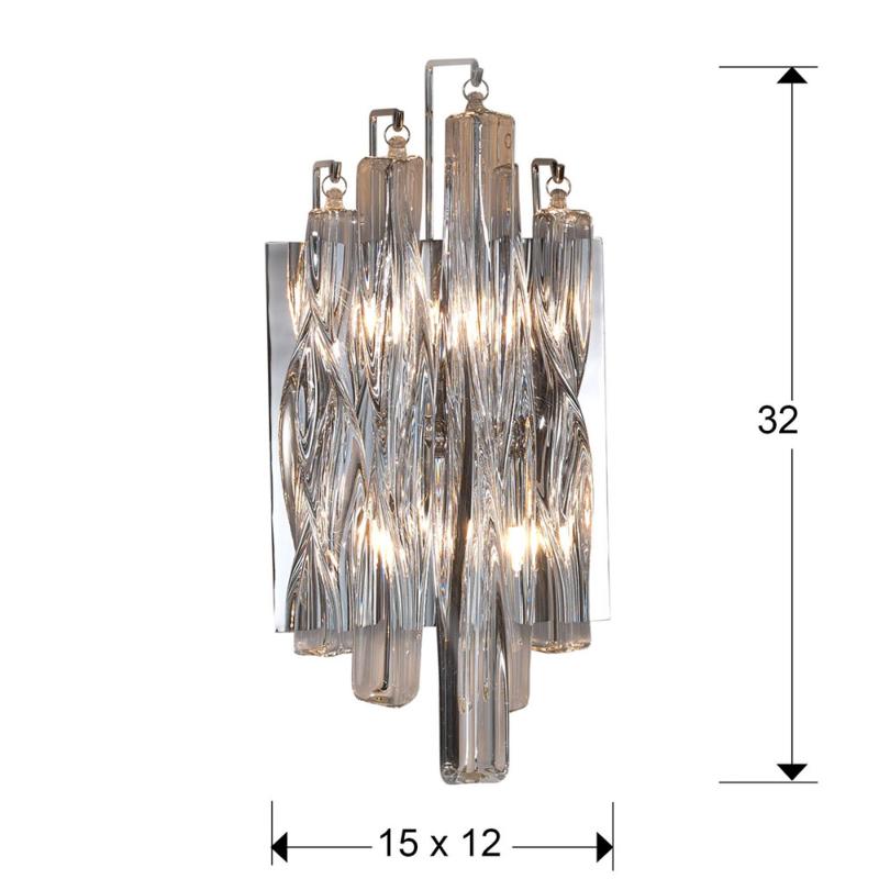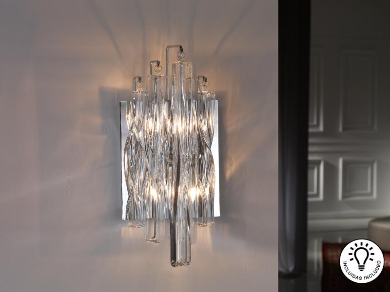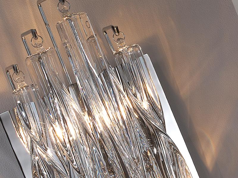 Lámpara de pared de 2 luces realizada en metal acabado cromo. Penduloques de barra de cristal transparente de alta calidad en forma de espiral.