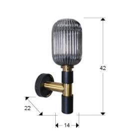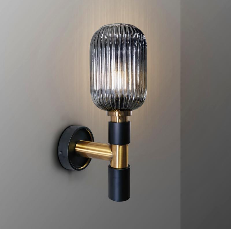 Lámpara de pared realizada en metal acabado negro mate, con detalles de latón satinado. Tulipa de cristal moldeado acabado gris smoke espejado.