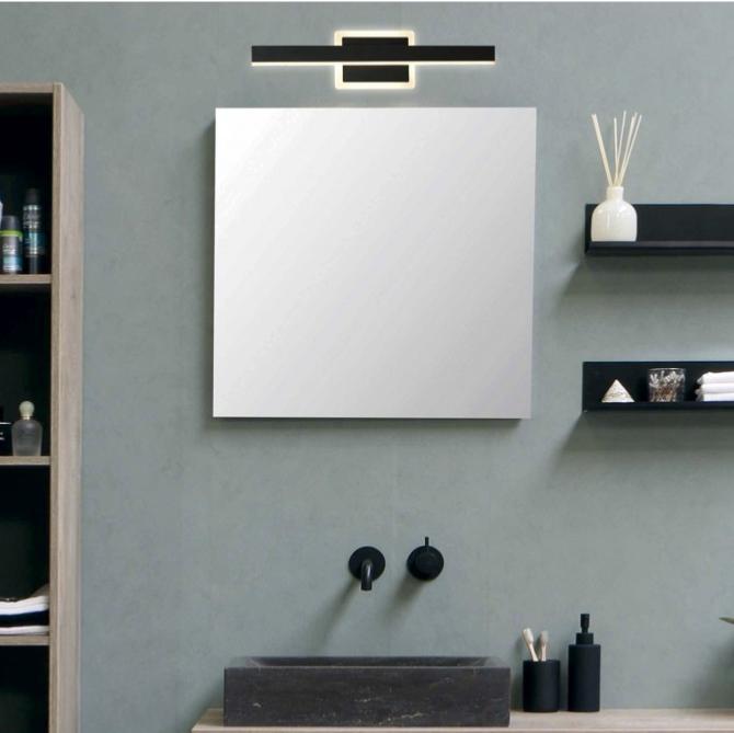 Aplique de la COLECCIÓN RIALTO en acabado Negro.Fabricado en metal.LED 14W / 4000K (no reemplazable).Incluye luz LED integrada en la base del aplique.Una pieza elegante y funcional, perfecta para colocar encima de espejos.