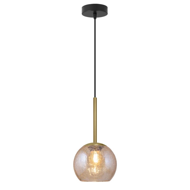 Lámpara colgante de la Colección Cacela. Fabricada en metal, en acabado latón y negro con tulipa en ambar Ø15cm. Usa bombillas E-27 compatibles con bombillas LED (no incluidas) 1 x E-27 40W Max. Ideal para ubicarlo en salones o dormitorios, ya sea en