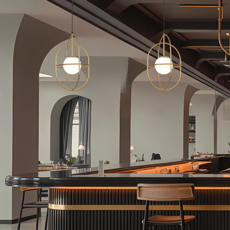 Colgante 1L de la colección ASTRO en acabado Dorado, con tulipa opal en el centro. Usa bombilla E-27, compatible con bombillas LED (no incluida)Medida pantalla: Ø30cm x H47Tamaño bola opal: Ø15cm.