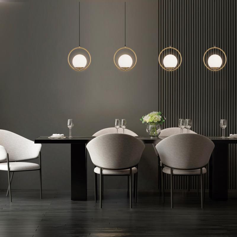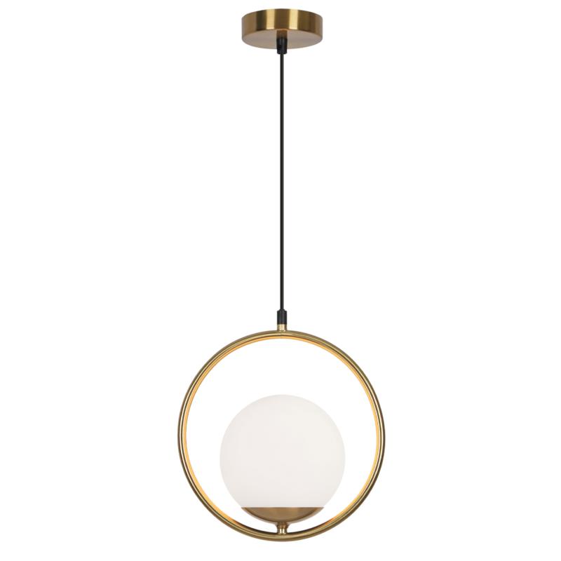 Lámpara de techo/ colgante de la Colección Odil. Fabricado en metal en acabado latón, un aro metálico del que pende un globo de cristal en acabado opal. Usa bombillas E14, 1 x E14 40W Max. compatible con bombillas Led (no incluidas).
