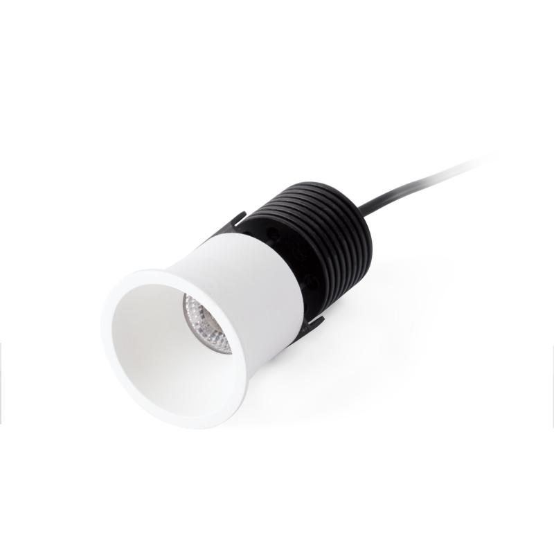 FOX 50 es un empotrable redondo blanco hecho de aluminio y de instalación intuitiva. Está pensado para la iluminación de proyectos comerciales y de hospitality. Material y Acabado Cuerpo: Aluminio / Tonalidad: Blanco MateDifusor: Cristal / Tonalidad: Transparente Iluminación Tipo: COB LEDPotencia Máxima: 7 WLúmenes: 479Luminaria regulable en intensidad (W): Yes/SiTonalidad de la luz: 2700KGrados de apertura de luz: 36CRI: >80 Medidas y Peso Medidas (mm) Altura Total: 87 / Longitud: 50 / Fondo: 50Diámetro Total (mm): 50Medidas de corte (mm): ø40Grosor máximo techo (mm): 30Peso: 0.16 Kg Otros datos de Interés IP: 20Protección anti corrosión: NoEAN: 8421776179585