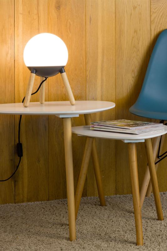 Luminaria de mesa gris diseñada por Nahtrang con estructura de madera y difusor de cristal. El material y la luz que fluye a través del difusor logran una atmósfera cálida.