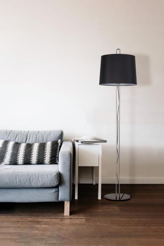 Lámpara de pie cromo con pantalla de tejido negra. MONTREAL es una colección de luminarias de diseño de Nahtrang. Gracias al pequeño gancho en la parte superior de sus estructuras, renueva una serie clásica para proyectos residenciales, de oficinas o de hospitality. Esta lámpara es ideal para iluminar una entrada o como iluminación puntual en un rincón.