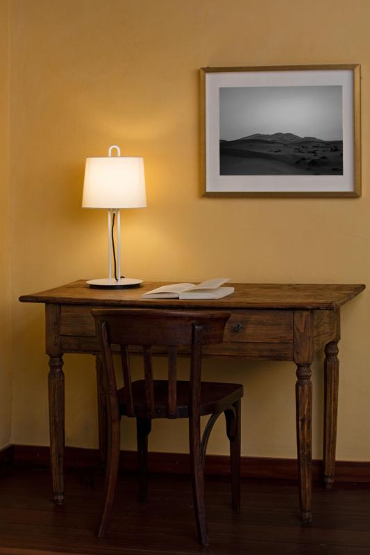 Luminaria de mesa blanca con pantalla de tejido beige. MONTREAL es una colección de luminarias de diseño de Nahtrang. Gracias al pequeño gancho en la parte superior de sus estructuras, renueva una serie clásica para proyectos residenciales, de oficinas o de hospitality. Esta lámpara es ideal para iluminar una entrada o como iluminación puntual en un rincón.
