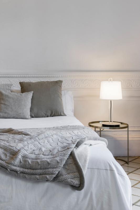 Luminaria de mesa blanca con pantalla de tejido blanca. MONTREAL es una colección de luminarias de diseño de Nahtrang. Gracias al pequeño gancho en la parte superior de sus estructuras, renueva una serie clásica para proyectos residenciales, de oficinas o de hospitality. Esta lámpara es ideal para iluminar una entrada o como iluminación puntual en un rincón.