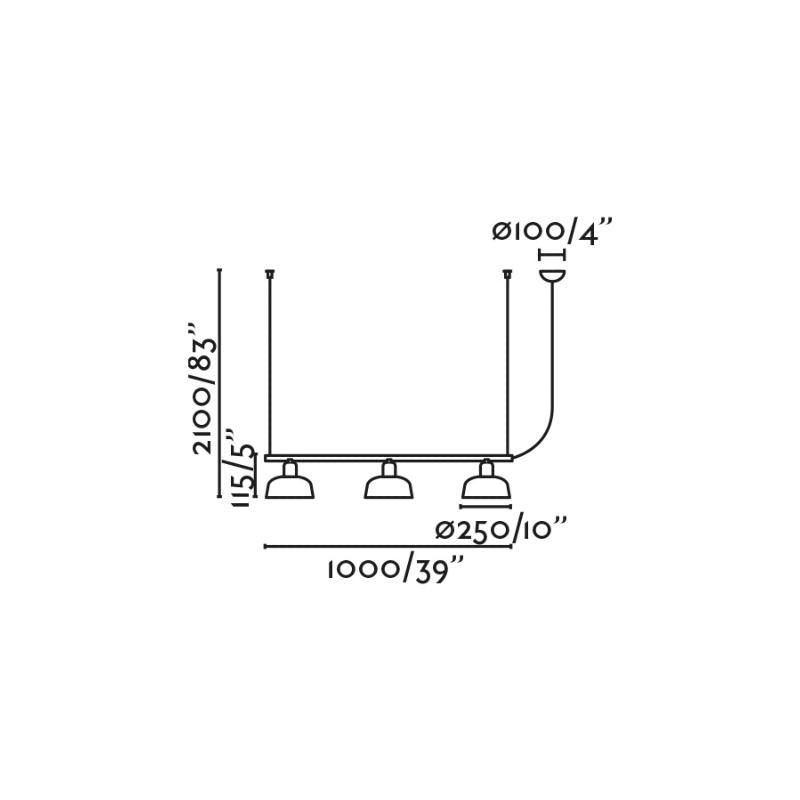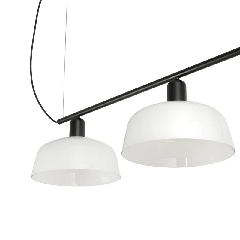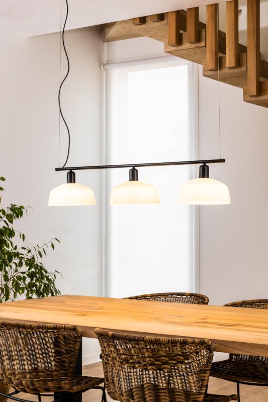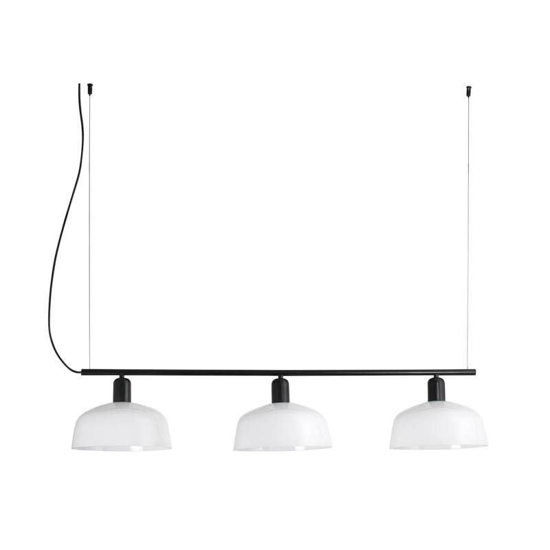 TATAWIN LINEAL M es una familia de luminarias diseñadas por Adolfo Abejón. La forma de la pantalla recuerda a la parte superior de las características viviendas de Tataouine, ciudad situada al sureste de Túnez. Esta lámpara colgante lineal de color negro tiene las pantallas de cristal blanco opal.