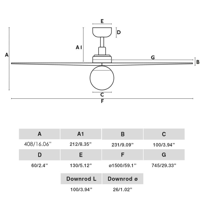 Materiales | - Base Motor: Acero - Aspas: Madera Natural - Difusor: Cristal | | Tonalidad de Metal | Negro Mate | Accionado mediante | Mando a distancia. | Programador de apagado | - | Numero de Aspas | 3 | Tonalidad de Aspas | Roble | Motor Tipo | DC - Bajo Consumo | Velocidades | 6 | Velocidades / Consumo | - 1ª velocidad: 67 rpm - 5w - 2ª velocidad: 88 rpm - 7w - 3ª velocidad: 106 rpm - 11w - 4ª velocidad: 122 rpm - 17w - 5ª velocidad: 140 rpm - 24w - 6ª velocidad: 159 rpm - 35w | | Flujo de Aire | 162 m3 | Función Invierno | Si. | Luz | Si. | | Equipado con | 1 Bombilla E-27 Tipo LED - 15w Max | Bombilla Incluida | No | Posible montaje sin Barra | No | Posible montaje en techo inclinado | Si* | Grafico de medidas Ventilador Klim L Faro |