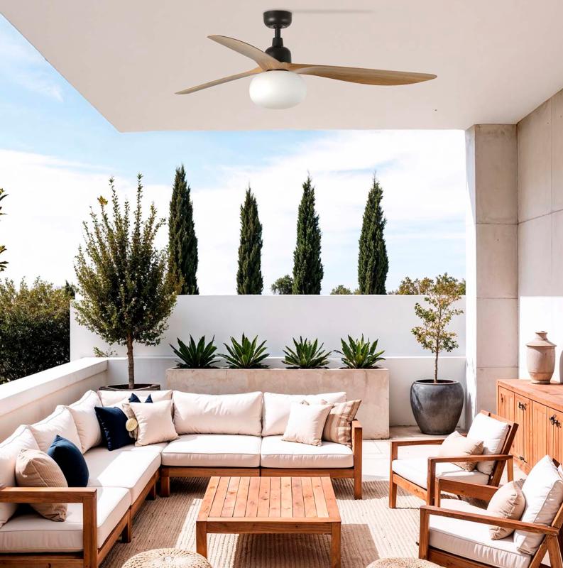 Materiales | - Base Motor: Acero - Aspas: ABS -Difusor: Cristal | | Tonalidad de Metal | Marrón oscuro | Accionado mediante | Mando a distancia. | Programador de apagado | Si | Numero de Aspas | 3 | Tonalidad de Aspas | Roble | Motor Tipo | DC - Bajo Consumo | Velocidades | 6 | Velocidades / Consumo | - 1ª velocidad: 73 rpm - 5w - 2ª velocidad: 92 rpm - 8w - 3ª velocidad: 108 rpm - 12w - 4ª velocidad: 127 rpm - 18w - 5ª velocidad: 141 rpm - 25w - 6ª velocidad: 152 rpm - 35w | | Flujo de Aire | 187 m3 | Función Invierno | Si. Activada en el mando. | Luz | Sí - 1 bombilla E27 (no incluida) | Posible montaje sin barra | No | Posible montaje en techo inclinado | Sí* | Grafico de medidas Ventilador Outwood L Faro |