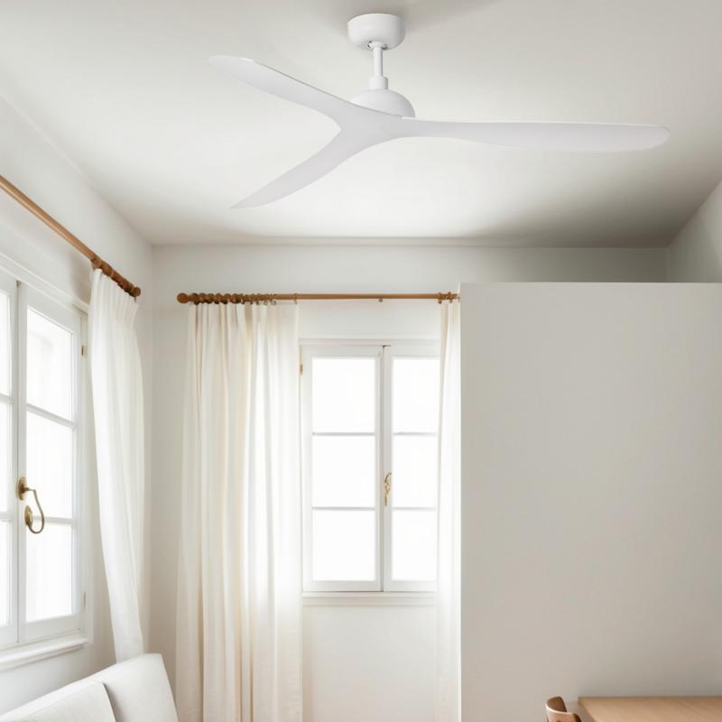 | Ventilador de techo Gotland Faro | | GOTLAND es un ventilador de techo de diseño sencillo y atemporal con motor DC. Funciona accionado por mando a distancia con programador, dispone de 6 velocidades regulables, función inversa y es apto para techos inclinados. Además, disponible en tonalidad negro con aspas oscuras. | Caracteristicas Ventilador Gotland - 132 Ø | Materiales | - Base Motor: Acero - Aspas: ABS | | Tonalidad de Metal | Blanco | Accionado mediante | Mando a distancia. | Programador de apagado | Sí. 1, 4 y 8 horas | Numero de Aspas | 3 | Tonalidad de Aspas | Blanco | Motor Tipo | DC - Bajo Consumo | Velocidades | 6 | Velocidades / Consumo | 1ª velocidad: 95 rpm - 4w 2ª velocidad: 121 rpm - 6w 3ª velocidad: 148 rpm - 10w 4ª velocidad: 177 rpm - 17w 5ª velocidad: 198 rpm - 23w 6ª velocidad: 214 rpm - 30w | | Flujo de Aire | 218 m3 | Función Invierno | Sí | Luz | No | Posible montaje sin Barra | No | Posible montaje en techo inclinado | Si/ | Grafico de medidas Ventilador Gotland Faro |