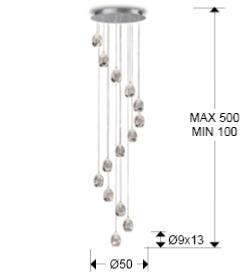 Lámpara de 14 luces LED. Realizada en metal acabado cromo. Tulipas con forma de gota de cristal macizo con burbujas en su interior y base de metal. Altura regulable, máx.500cm. DIMABLE por BLUETOOTH con APP para smartphone.70W LED, 6.720 lm. 3.000K