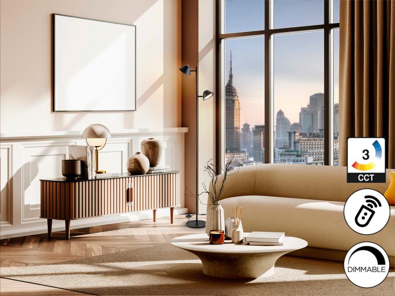 Lámpara de pie realizada en metal y alumnio, color negro mate, difusor opal. Pulsador táctil y CONTROL REMOTO. 2 luces orientables, funciones simultaneas e independientes: luz dimable, temperatura de color regulable. 20W LED, 1800 lm, CCT 3000-6500K.