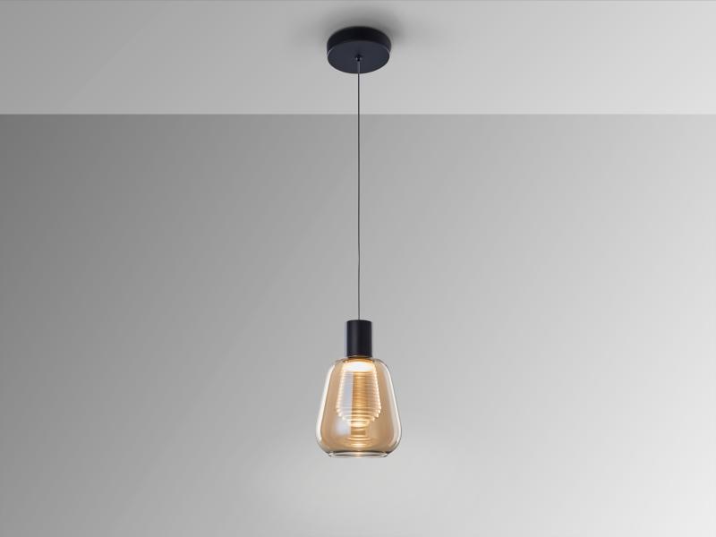 Lámpara de 1 luz, realizada en metal acabado negro mate. Doble tulipa, exterior realizada en cristal ámbar y difusor interior en policarbonato transparente con franjas escalonadas. Regulable en altura. 5W LED, 350 lm, 3.000K