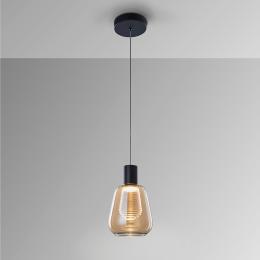 Lámpara de 5 luces, realizada en metal acabado negro mate. Doble tulipa, exterior realizada en cristal ámbar o smoke espejado, con difusor interior en policarbonato transparente con franjas escalonadas. Regulable en altura. 25W LED, 1.750 lm, 3.000k