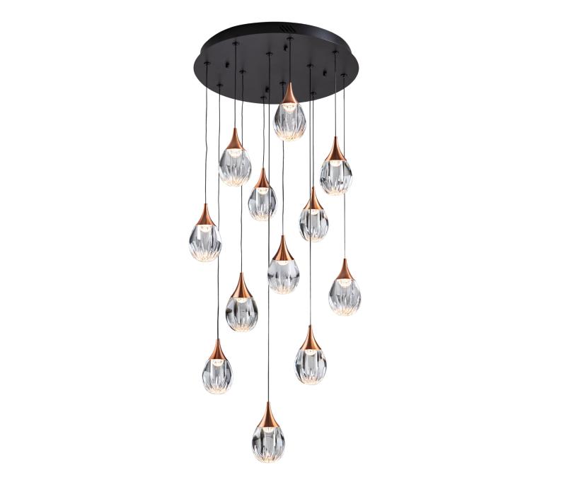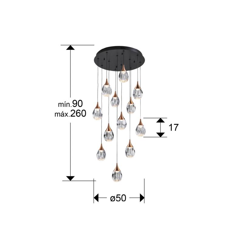 CORINA- LAMPARA 12L NEGRO-COBRE - SCHULLERLámpara de 12 luces realizada en metal acabado negro mate y detalles en cobre. Tulipas moldeadas de acrílico transparente. Regulable en altura. 72W LED, 2971 lm. 3.000 K. DIMABLE, Incluye driver TRIAC y SET DIMADO. Material/Tonalidad - Materiales: Metal, acrílico./Metal, acryli - Acabado: Negro, cobre, transparente/Bla Iluminación - Potencia Eléctrica: 72W - Lúmenes: 2971 - Tonalidad de la luz: 3000 K - Regulable mediante: PULSADOR - Tensión: 180/240 V - Frecuencia: 50/60 Hz - Vida Media: 50000 Horas - CRI: 94 Medidas - Articulo: Diámetro 50 cms / Alto 17 cms - Lámpara instalada: Altura Mínima 90 cms / Altura Máxima 260 cms - Peso: 11,9 Kg - Pantalla/Tulipa: Diámetro 10 cms / Alto 10 cms - Florón de techo: Diámetro 46 cms / Alto 5 cms Otros Datos de Interés - IP: IP 20 - Código EAN: 8435435342678.0 - Colección: Corina