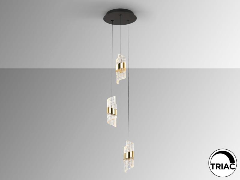 Lámpara de 3 luces LED. Realizada en metal acabado negro mate y oro brillo. Tulipas con diseño en espiral, realizadas en acrílico moldeado y tallado. Regulables en altura. 21W LED. 1.899 lm. 3.000 K. DIMABLE.