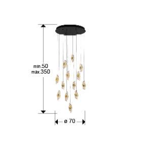 Lámpara de 13 luces LED. Realizada en metal acabado negro mate y oro brillo. Tulipas con diseño en espiral, realizadas en acrílico moldeado y tallado. Regulables en altura. 91 W LED. 8.370 lm. Incluye driver TRIAC y SET de dimado.