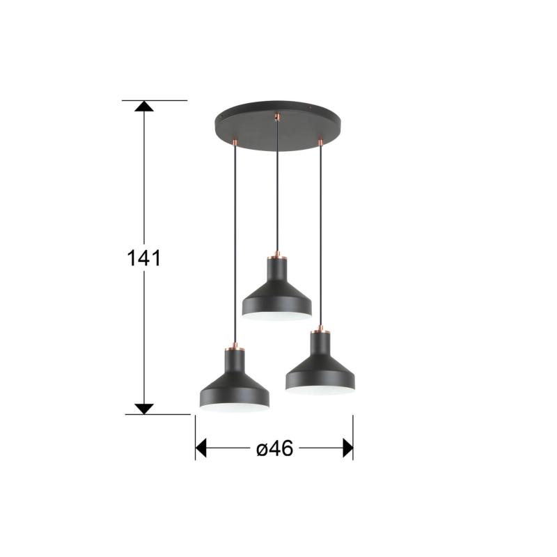 IRIAS LAMPARA 3L NEGRO-COBRE D45 - ILUMINACION i3 By SCHULLERLámpara redonda de 3 luces realizada en metal acabado negro mate y detalles en cobre satinado. Altura regulable. 3 E27 Material/Tonalidad - Materiales: Metal./Metal - Acabado: Negro mate, cobre satinado./Ma Iluminación - Potencia Eléctrica: 3x20W - Tensión: 110/220 V - Frecuencia: 50/60 Hz Medidas - Articulo: Diámetro 46 cms / Alto 17 cms - Lámpara instalada: Altura Mínima 35 cms / Altura Máxima 150 cms - Peso: 2,07 Kg - Pantalla/Tulipa: Diámetro 18 cms / Alto 16 cms - Florón de techo: Diámetro 35 cms / Alto 3 cms Otros Datos de Interés - IP: IP 20 - Código EAN: 8435435342913.0 - Colección: Irias