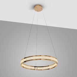 Lámpara con tres aros, realizada en acero y aluminio, acabado dorado brillo. Difusor de piezas de cristal texturizado. Regulable en altura. Iluminación LED 79W, 3.000K .6,300 lm. Incluye driver TRIAC y SET DIMADO.