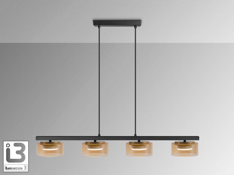 OLAIA- LAMPARA 4L NEGRO-AMBAR - ILUMINACION i3 By SCHULLERLámpara realizada en metal acabado negro mate y oro. 4 Tulipas de cristal ambar. Regulable en altura. Material/Tonalidad - Materiales: Metal, cristal./Metal, glass - Acabado: Negro mate, oro, ambar./Matt b Iluminación - Número de Bombillas: 4 - Tipo de Bombillas: GX53 - Bombillas incluidas: Sí - Potencia por Bombilla: 6W - Voltaje de Bombilla/s incluidas: 220/240 V - Potencia Eléctrica: 4x6W - Lúmenes: 2640 - Lúmenes por Bombilla: 660.0 - Tonalidad de la luz: 3000 K - Tensión: 220/240 V - Frecuencia: 50/60 Hz - Frecuencia de Bombilla: 50/60 Hz Medidas - Articulo: Ancho 91 cms / Fondo 13 cms / Alto 11 cms - Lámpara instalada: Altura Mínima 30 cms / Altura Máxima 110 cms - Peso: 2,38 Kg - Pantalla/Tulipa: Diámetro 13 cms / Alto 6 cms - Florón de techo: Ancho 26 cms / Alto 3 cms / Fondo 6 cms Otros Datos de Interés - IP: IP 20 - Código EAN: 8435435343118.0 - Colección: Olaia