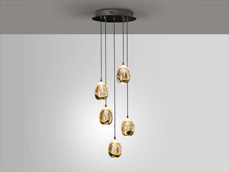 Lámpara de 5 luces LED, realizada en metal, acabado negro mate y oro brillo. Tulipas con forma de gota realizadas en cristal macizo con burbujas decorativas en su interior, en tono champán. Regulable en altura. 25W LED. 2400 lm. 3000 K. DIMABLE.