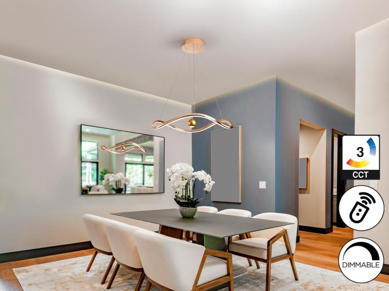 Lámpara realizada en aluminio y acero acabado en dorado brillo. Difusor de silicona opal. Permite regular la altura manualmente tirando de la bola central. Iluminación LED 50W, CCT: 2700-5000 K. 3,100 lm. DIMABLE. Incluye mando a distancia.