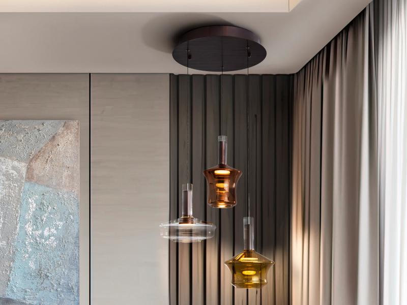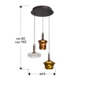 Lámpara de 3 luces, realizada en aluminio cepillado acabado en tono bronce oscuro. Tulipas de cristal espejado con baño electrolítico en tonos cobre, dorado y cristal transparente, con luz LED y difusor de acrílico opal. 18W LED, 570 lm, 3000K