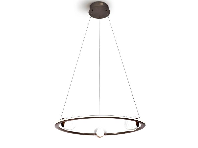 Lámpara en acero y aluminio cepillado, acabado en bronce anódico. Tres esferas de cristal, interior opal y exterior transparente. Difusor de silicona opal. DIMABLE, 40W LED, 2700lm, 3000K. Incluye driver TRIAC y SET DIMADO.