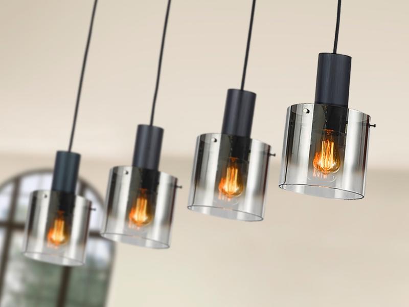 Lámpara realizada en metal acabado negro satinado. 4 Tulipas de cristal smoke difuminado. Cable textil. Regulable en altura. Portalámparas E27