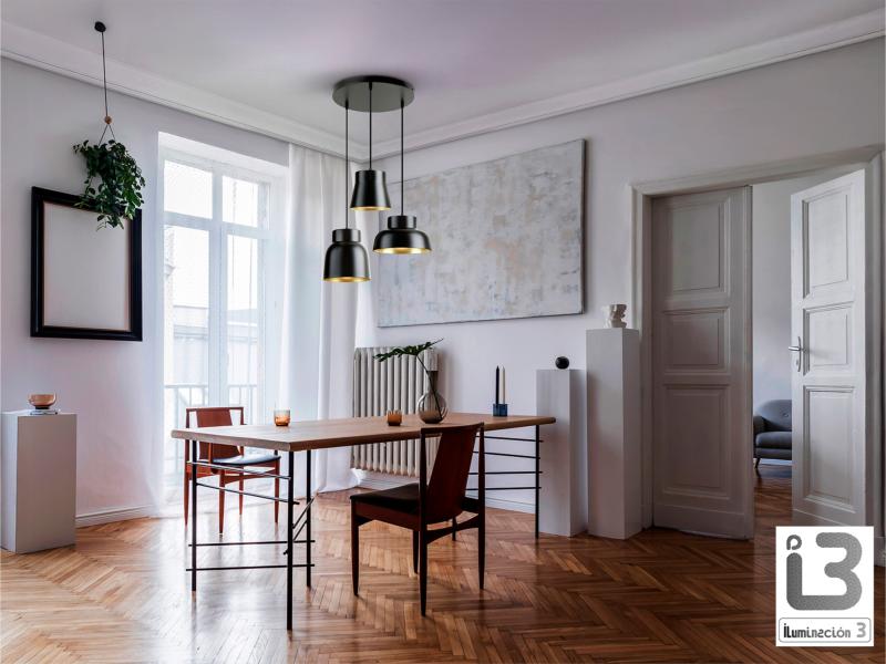 Lámpara redonda de 3 luces, realizada en metal acabado negro mate y dorado. Regulable en altura. 3 E27