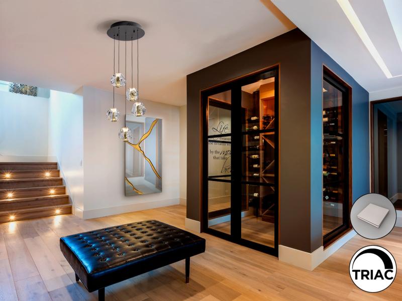 Lampara de 5 luces, realizada en metal acabado negro mate con detalles dorados y tulipas de acrílico transparente. 21W LED, 1456 lm, 3000K. Incluye driver TRIAC y SET DIMADO.