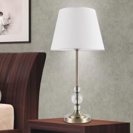 Lampara de pie Marela Pie salón de la colección MARELA. Fabricado en metal, acabado oro envejecido, pantalla tela blanca, 4 bolas de vidrio transparentes. 1 x E27 / 60WMax. Cable PVC negro de 1,8mts.