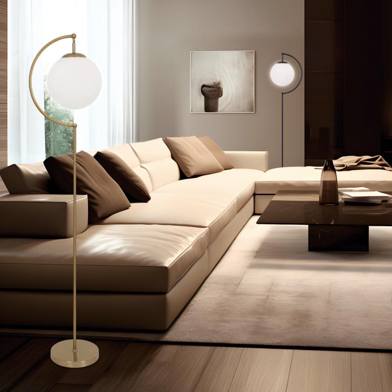 Lampara de pie Midas Latón AlemarPie salón de la colección Midas. Fabricado en metal, acabado Latón, difusor cristal opal.