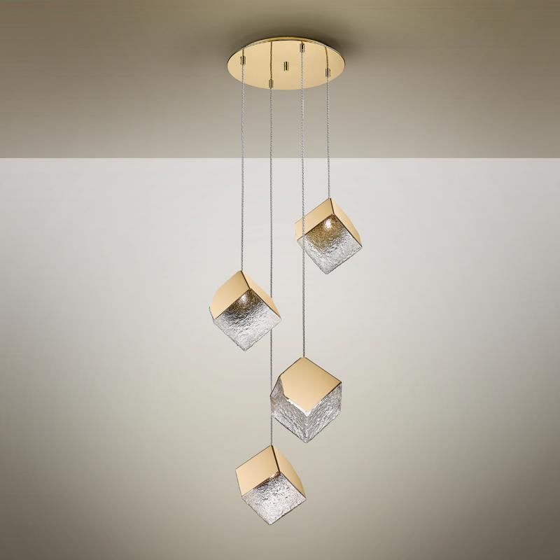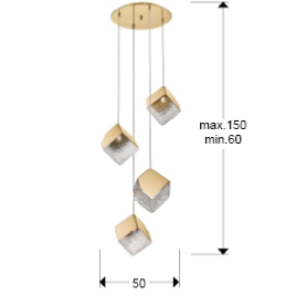 Lámpara redonda de 4 luces, realizada en metal y acero acabado oro. Tulipa cúbica de cristal texturizado. Regulable en altura.