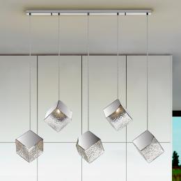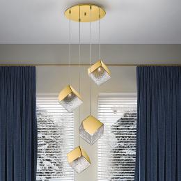 Lámpara de 5 luces, realizada en metal y acero, acabado oro. Tulipa cúbica de cristal texturizado. Regulable en altura.