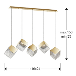 PRISCILA- LAMPARA 5L ORO - SCHULLERLámpara de 5 luces, realizada en metal y acero, acabado oro. Tulipa cúbica de cristal texturizado. Regulable en altura. Material/Tonalidad - Materiales: Metal, acero, cristal/Metal, s - Acabado: Dorado, texturizado./Golden, t Iluminación - Número de Bombillas: 5 - Tipo de Bombillas: G9 - Bombillas incluidas: Sí - Potencia por Bombilla: 6W - Voltaje de Bombilla/s incluidas: 220 V - Potencia Eléctrica: 5x10W - Lúmenes: 2750 - Lúmenes por Bombilla: 550.0 - Tensión: 220/240 V - Frecuencia: 50 Hz - Frecuencia de Bombilla: 50 Hz Medidas - Articulo: Ancho 116 cms / Fondo 24 cms / Alto 24 cms - Lámpara instalada: Altura Mínima 35 cms / Altura Máxima 150 cms - Peso: 7,1 Kg - Pantalla/Tulipa: Ancho 24 cms / Alto 24 cms / Fondo 22 cms - Florón de techo: Ancho 98 cms / Alto 3 cms / Fondo 6 cms Otros Datos de Interés - IP: IP 20 - Tiempo aproximado de montaje: 12 Minutos - Código EAN: 8435435335472.0 - Colección: Priscila