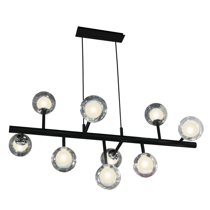 LAMPARA 9L·ALTAIS·NEGRO/CROMO - SCHULLERLámpara realizada en metal, acabado negro mate con detalles cromados. Tulipas esféricas con doble cristal, interior opal y exterior transparente. Material/Tonalidad - Materiales: Metal, cristal/Metal, glass - Acabado: Negro mate, cromo, opal-transp Iluminación - Número de Bombillas: 9 - Tipo de Bombillas: G9 - Bombillas incluidas: Sí - Potencia por Bombilla: 6W - Voltaje de Bombilla/s incluidas: 220 V - Potencia Eléctrica: 9x10W - Lúmenes: 4950 - Lúmenes por Bombilla: 550.0 - Tensión: 220/240 V - Frecuencia: 50 Hz - Frecuencia de Bombilla: 50 Hz Medidas - Articulo: Ancho 92 cms / Fondo 54 cms / Alto 50 cms - Lámpara instalada: Altura Mínima 65 cms / Altura Máxima 155 cms - Peso: 3,2 Kg - Pantalla/Tulipa: Diámetro 12 cms - Florón de techo: Ancho 26 cms / Alto 3 cms / Fondo 11 cms Otros Datos de Interés - IP: IP 20 - Código EAN: 8435435326791.0 - Colección: Altais