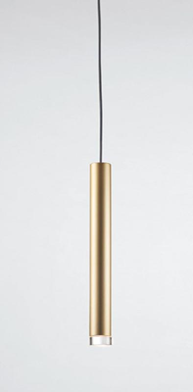 Colgante Candle Leds-C4. Colgante moderno con formato minimalista, decorado en laton. Estructura en formato cilindrico con LED en punta. Posibilidad de montar como Accesorio el plato inferior expuesto en fotografias adjuntas. | INFORMACION GENERAL | | | Iluminacion: Tipo: LED Pontencia: 1x3w Lumens: 174. Color de la Luz: 2700k, Calida. Incluido: Sí. Otros datos: Material: Acero + difusor PMMA. Acabado: Laton satinado mate. Regulable en altura: Sí. | | | | | DIMENSIONES | | | Diametro Ø2,5cm Altura cilindro: 31,6cm. Altura minima: 40cm. Altura maxima 250cm.  | - ENLACES DE INTERES: