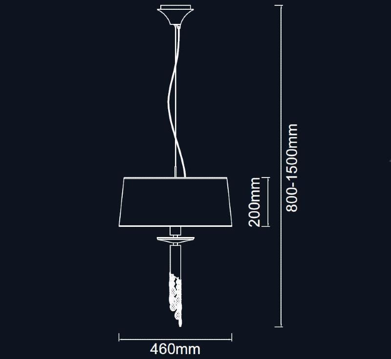 Lampara Tiffany Mantra. Lampara colgante de techo Tiffany. Realizada en metal acabado cromo brillo, pantalla de tela tableteada semitransparente blanca. Monta iluminación inferior bajo brazo destinada, a la iluminación de los abalorios de cristal facetados, engarzados en forma de cadenas, que monta en su enfilaje. - Medidas: Diámetro 46cm. Altura 80cm, max 150cm. - Tonalidad: Cromo brillo. - Iluminación: 3 E-27 max 20w + 1 G9 max 5w. No incluidas - Enlaces de interes: