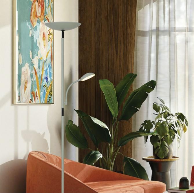 Pie de salon de la Colección KOS en acabado verde, fabricado en metal.Base de Ø24 cm.LED ARRIBA 18W 1900LM 3000-6500KLED LECTOR 5W 470LM 3000KDimable mediante doble terruptor On/Off en el tubo.