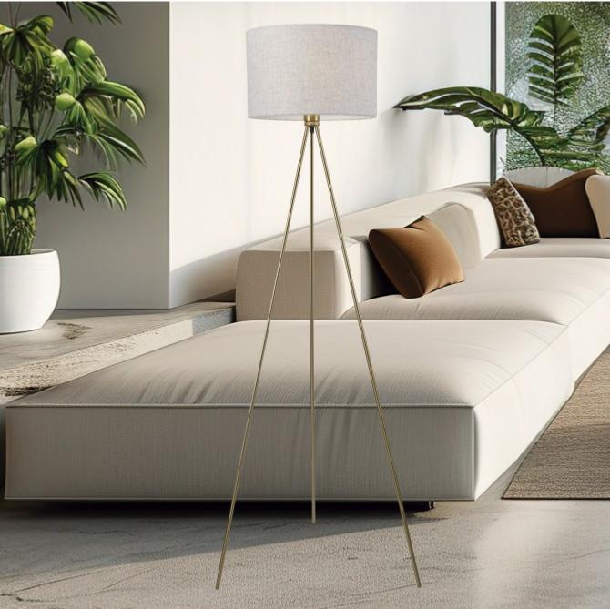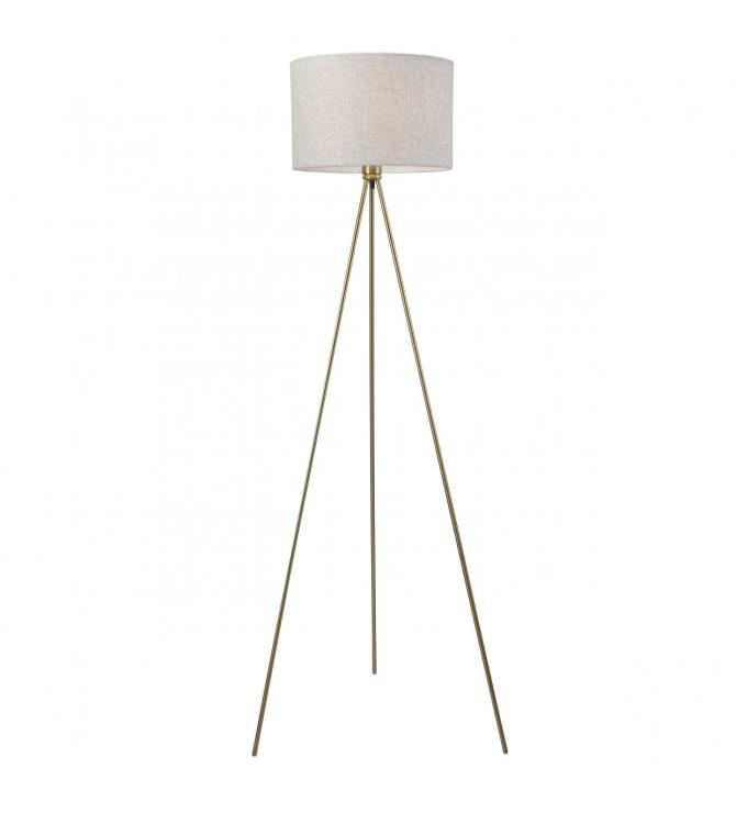 Pie de salón de la Colección TIVOLI, fabricado en metal con acabado en Latón y pantalla de tela de lino.Espacio entre barras: 35 cm.Cable PVC negro con interruptor de pie, cae desde el portalámparas.