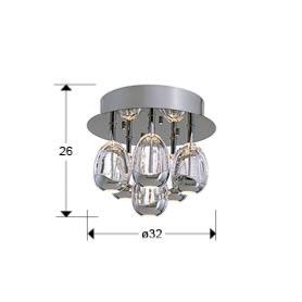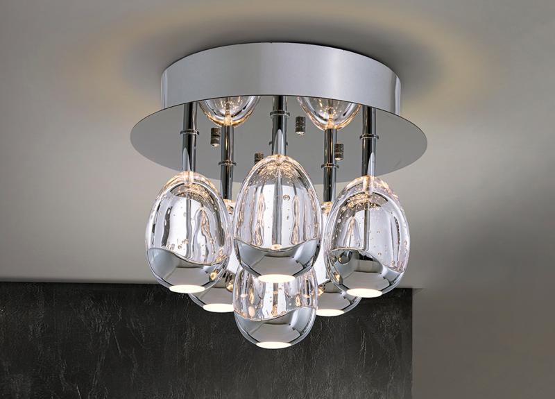 Plafón de techo de 6 luces LED. Realizado en metal acabado cromo. Tulipas con forma de gota realizadas en cristal macizo con burbujas decorativas en su interior. 29W LED. 2.800 lm. 3.000 K. DIMABLE. Driver TRIAC y SET DIMADO.