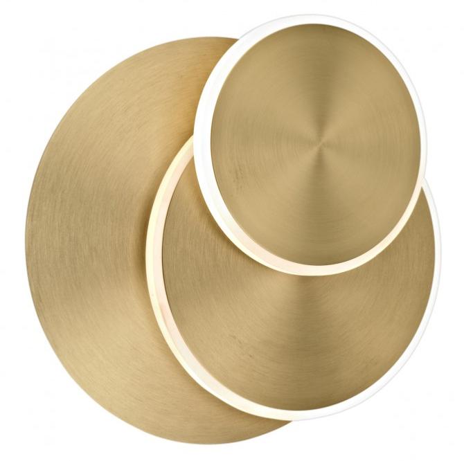 Aplique de pared de la Colección BOSSA, fabricado en metal y metacrilato en acabado en Latón. Un diseño singular a la par que sencillo, en el que dos circunferencias orbitan sobre su eje dejando a nuestro antojo su colocación. LED integrado