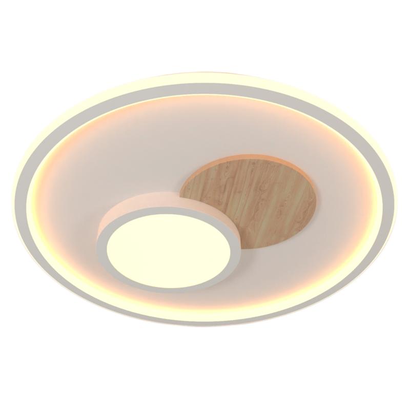 Plafón Led de la Colección TANA (74W). Fabricado en metal en acabado blanco/madera con difusor en metacrilato. Led integrado CON regulador de intensidad, cambio de temperatura de color, temporizador y modo noche. Incluye mando a distancia. LED 74W 4868LM