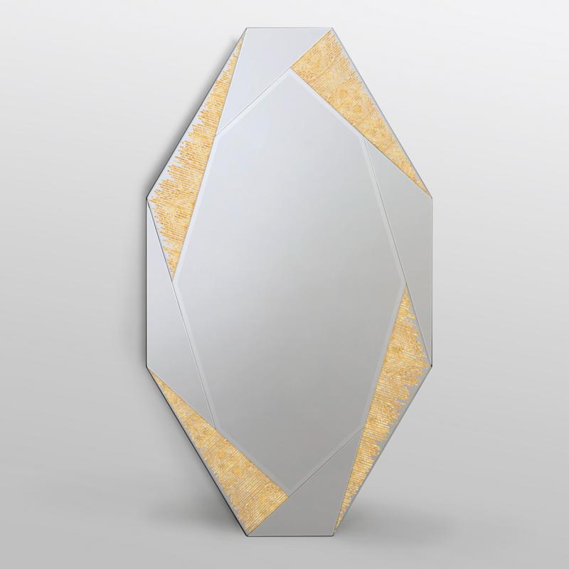 Espejo LAVERNA Grande Oro Schuller. Espejo con lunas biseladas y grafismo en PAN DE ORO. Trasera de DM lacado en negro. Preparado para colgar en posición horizontal o vertical. DIMENSIONES: -Alto: 180 cm. Ancho: 100 cm Grosor 2.5 cm. ENLACES DE INTERES