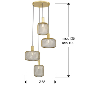 OSIRIS LAMPARA 4L ORO - SCHULLERLámpara redonda de 4 luces realizada en metal, Incluye 2 diseños de tulipas de malla metálica. Acabado pintura oro. Cable enfundado textil negro. Material/Tonalidad - Materiales: Metal./Metal - Acabado: Pintura oro./Golden paint Iluminación - Número de Bombillas: 4 - Tipo de Bombillas: E27 - Bombillas incluidas: Sí - Potencia por Bombilla: 8W - Voltaje de Bombilla/s incluidas: 220/240 V - Potencia Eléctrica: 4x20W - Lúmenes: 3480 - Lúmenes por Bombilla: 870.0 - Tensión: 220/240 V - Frecuencia: 50/60 Hz - Frecuencia de Bombilla: 50/60 Hz Medidas - Articulo: Diámetro 58 cms / Alto 120 cms - Lámpara instalada: Altura Mínima 100 cms / Altura Máxima 150 cms - Peso: 3,84 Kg - Florón de techo: Diámetro 33 cms / Alto 3 cms Otros Datos de Interés - IP: IP 20 - Código EAN: 8435435335571.0 - Colección: Osiris