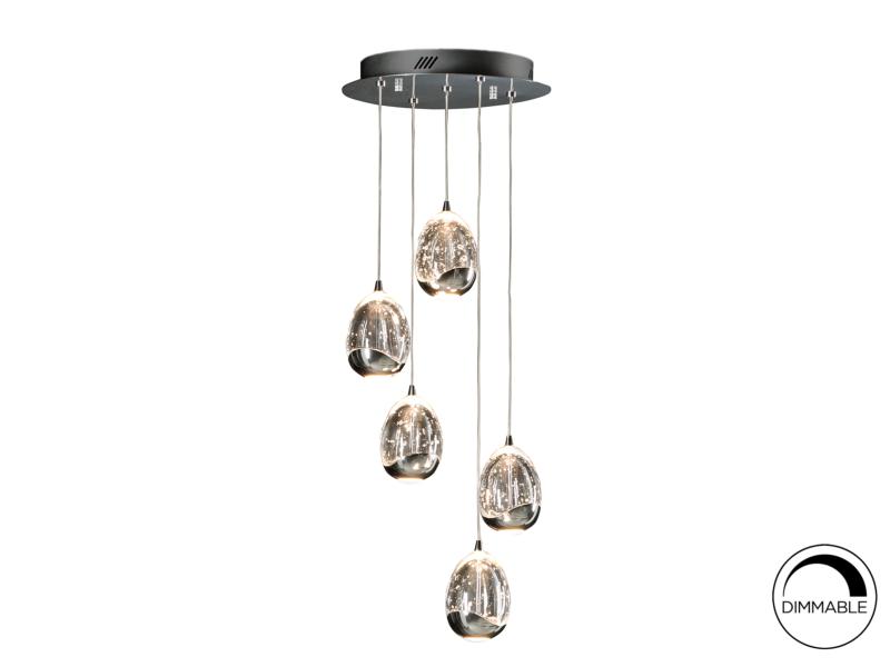 Lámpara de 5 luces LED. Realizada en metal acabado cromo. Tulipas con forma de gota realizadas en cristal macizo con burbujas decorativas en su interior. Regulables en altura. 25W LED. 2.400 lm. 3.000 K.