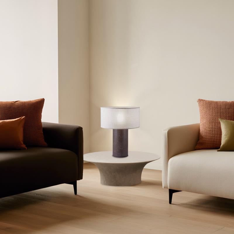 Sobremesa de la Colección BRANDY, de fabricación propia, elaborada con especial cuidado en los detalles, combinando metal negro y tela con un acabado artesanal. Pantalla de tela en acabado mármol de Ø30 cm.