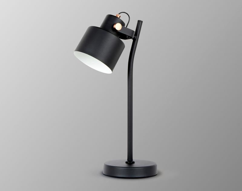 Lámpara de sobremesa realizada en metal acabado negro mate, detalles en cobre satinado. Pantalla con inclinación regulable. 1 E27